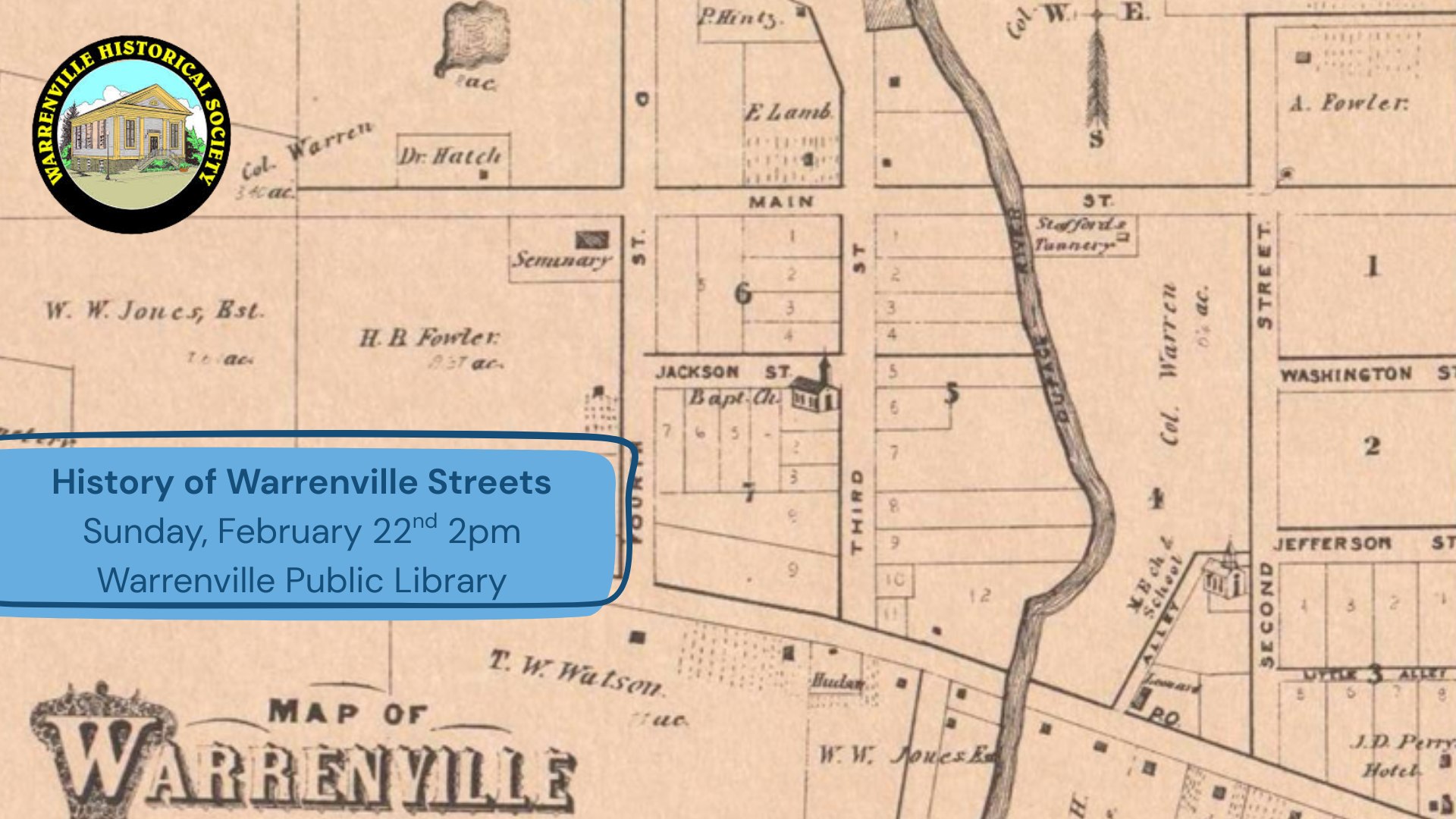 Join the Warrenville Historical Society on Sunday, February 22nd at 2pm at the Warrenville Library, 28W751 Stafford Place, to learn about the history behind the names of Warrenville streets and the growth of the City. To register for the free program visit www.warrenville.com.